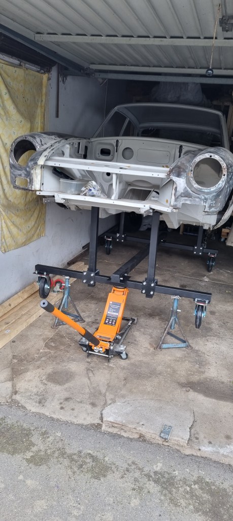 Back in the garage it was time to assembly the dolly I built two weeks ago. This was not finished because I applied a few layers of paint. The dolly makes switching to and from the roll-over jig much easier – it just needs to be jacked up and on stands. This is helpful for the transport and handling at the body-shop.