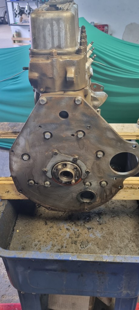 My plan was to a “rattle-can plus” overhaul. This means removing everything attached to the engine – just leaving the cylinder head and timing chain in place. Most of the necessary parts for this were ordered along the line. One of the thermostat housing studs broke and it took a while to get this part off. Various wire brush attachments, degreaser, a lot of elbow grease and five hours later the block is almost ready for painting. But because the oil pan and time chain cover were really rusted – I decided to take them off too.