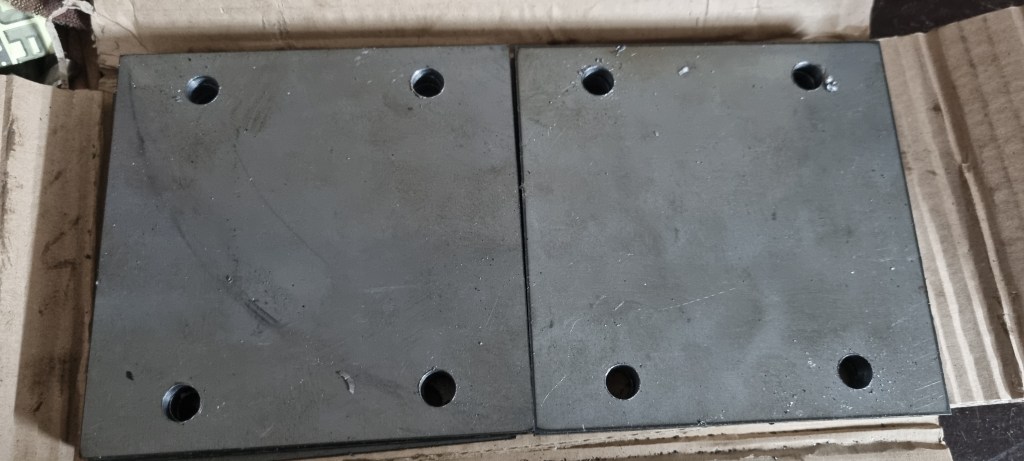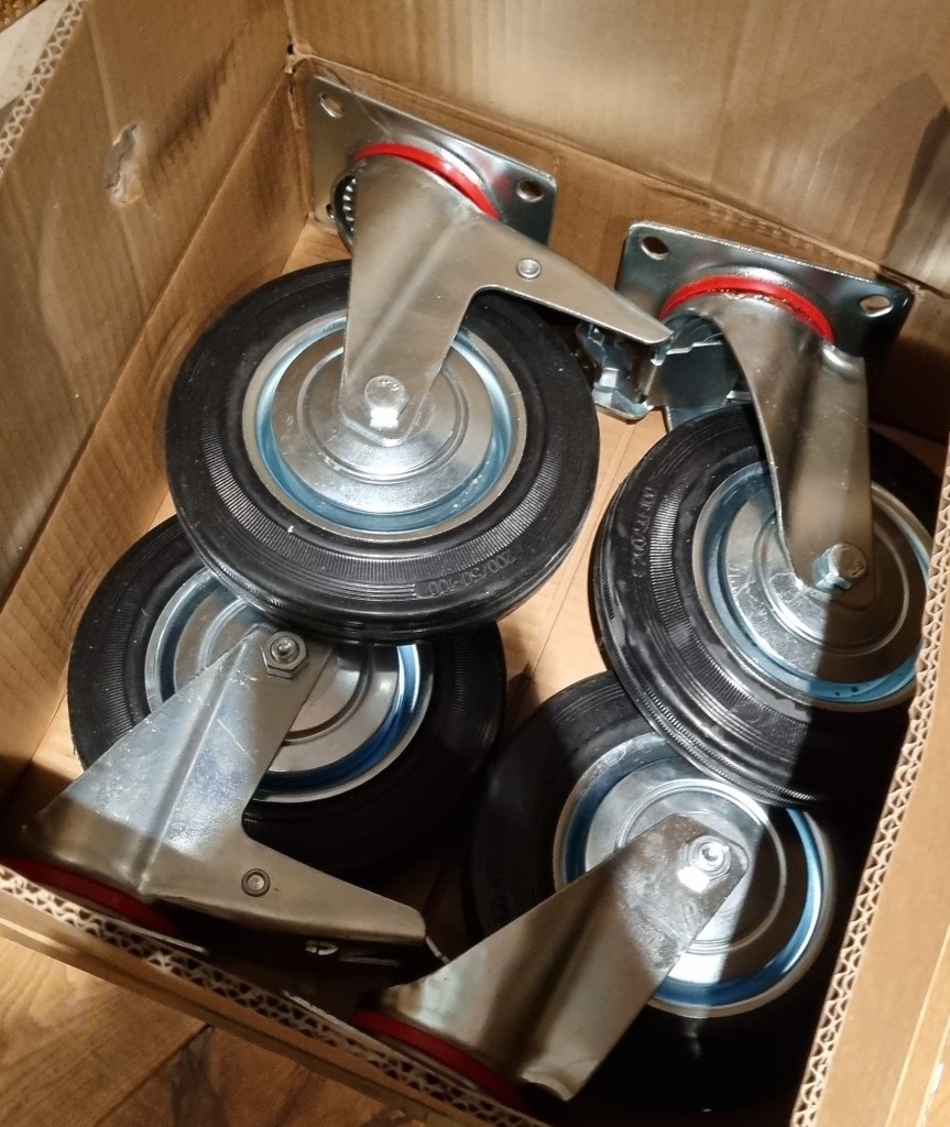 On Wednesday new 130x130x5mm steel anchor plates arrived. These are to attach larger castor wheels – an upgrade for the roll-over jig. I did consider ordering predrilled plates but thankfully decided against it this time. Turns out that the measurements and drawing for the mounting holes on the Amazon page are completely off. Yesterday the castors were in the mail and the holes need to be 100 by 75 mm apart – instead of 75 by 60mm.