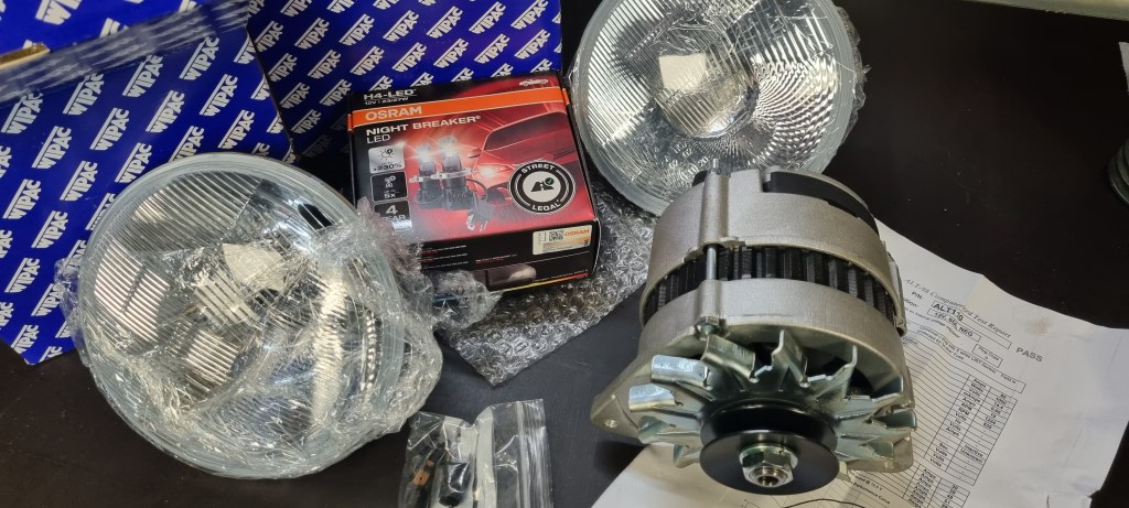 Speaking of parts: AutoElectricSupplies did another super-fast delivery. A set of Wipac headlights and a new alternator arrived today (ordered on Wednesday). The alternator is intended for Miffi – but I might be using it on the MGB 18V engine first. The headlights are the only ones allowed on classic LED conversions with Osram Nightbreaker LEDs. They will be fitted on a fellow MGB driver’s car this weekend.