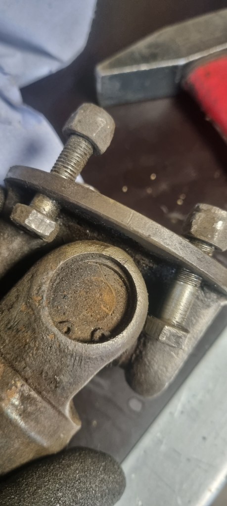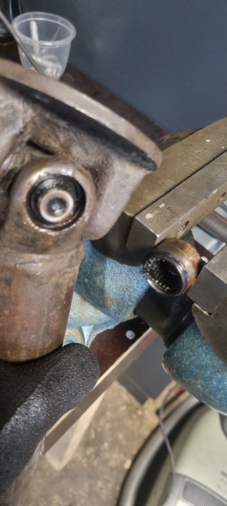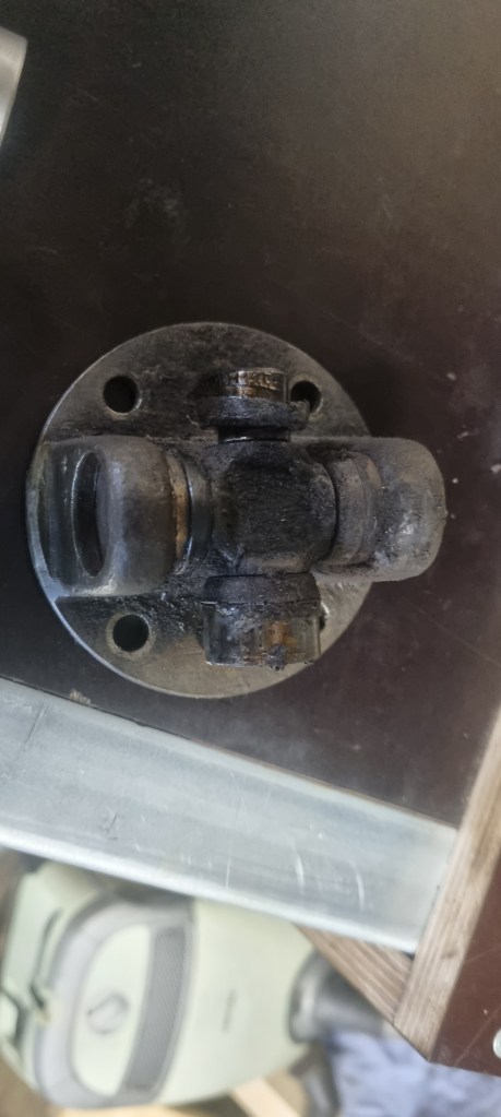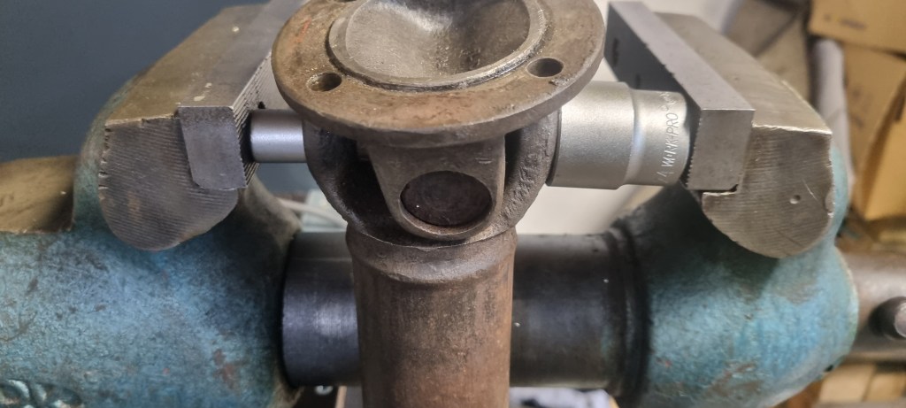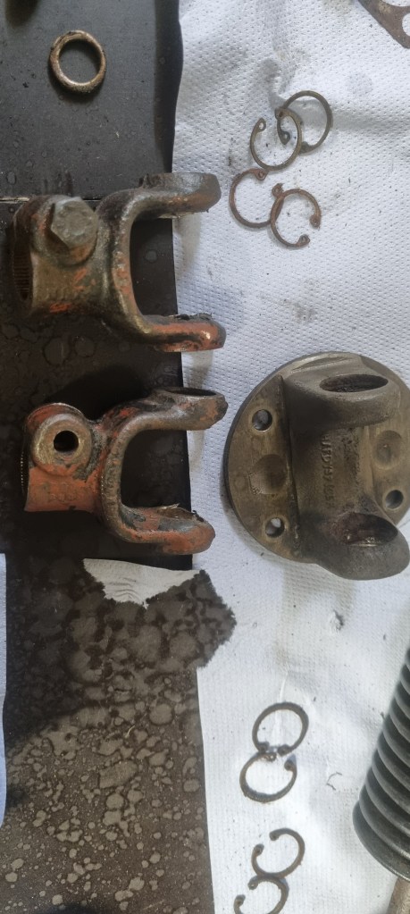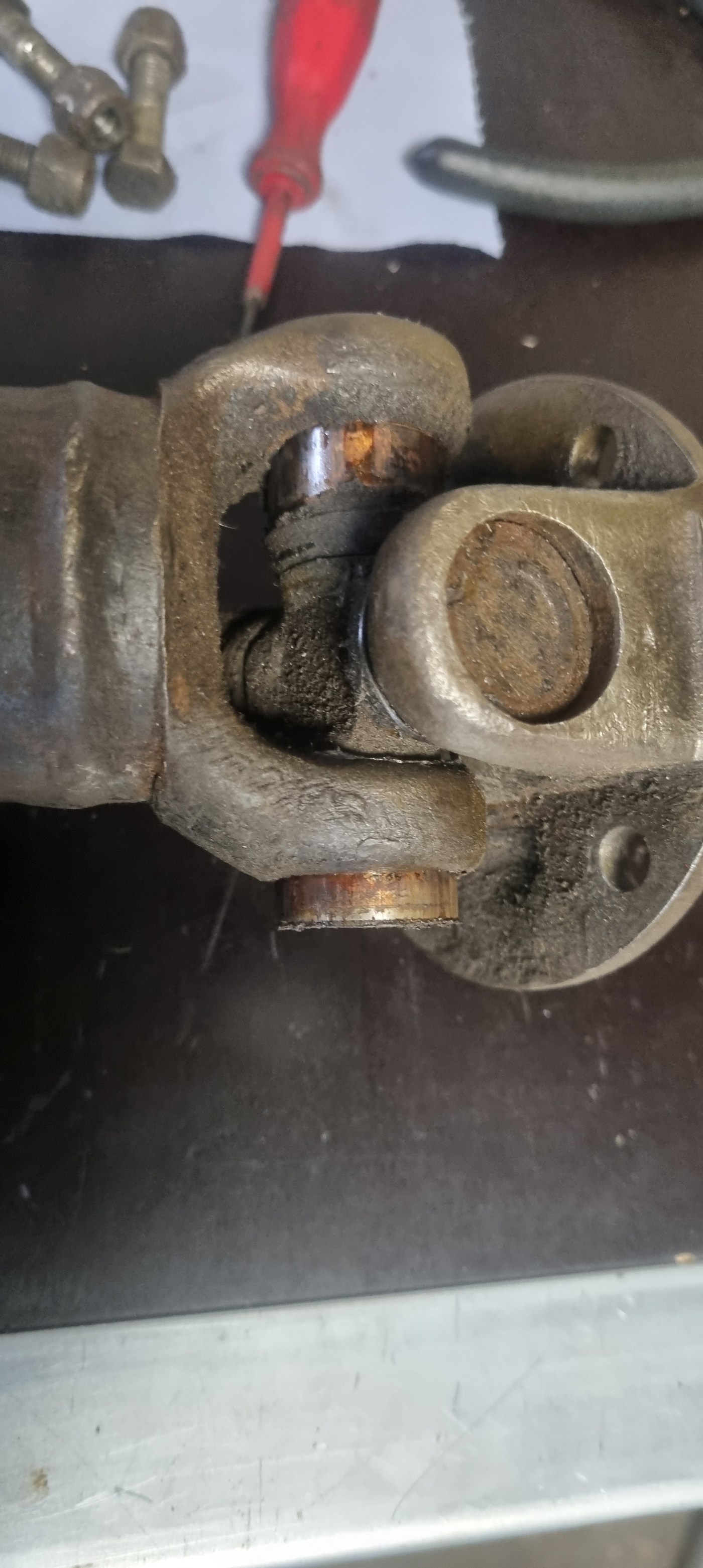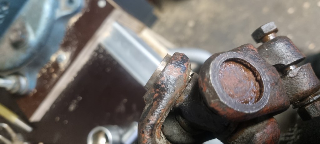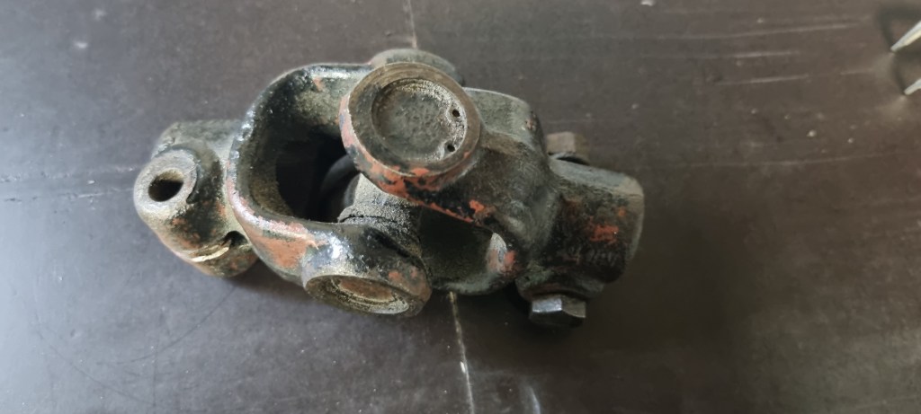 As I also have another prop shaft which has a completely seized bearing on one side – I decided to test the procedure on those bearings again. The bearings on the side I had to fix were out in a few minutes. Then I noticed that a bit of dirt (turned out to be metal) is preventing the yoke on the steering column to push out the bearing further. A bit of cleaning and a few wacks with the hammer – and I could also pull the bearing easily.