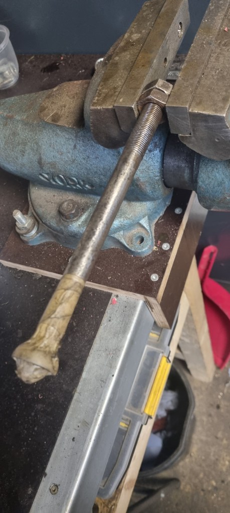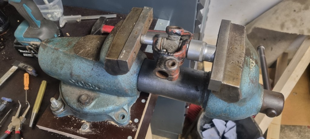 But before I could do this, I had to get my vise back on top the bench. This was mounted on the far left of the bench before – but as the Morgan is blocking this part of the bench – I wanted to have more flexibility of placing the vise on the bench it in the future. I wacked together a simple holder and had to drill through the new bench top. Needs some refinement – I will work on this tomorrow. After getting the vise temporarily attached to the bench – I tried to grip the bearing with the vise. Worked fine for the prop shaft last time, but I could not get to work on the small steering column U-joint. It slipped out a couple of times and I just ended up damaging the jaws of my vise.