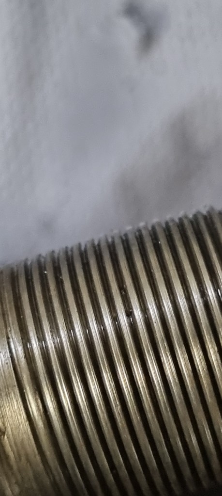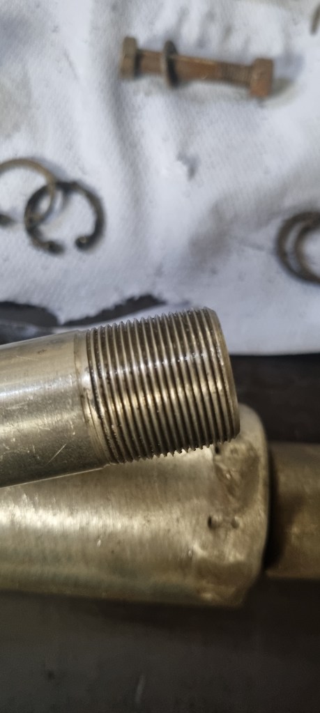 The next two hours went into cleaning dirt and rust off all parts with the wire wheel and a clear-strip disc. The tie-rod threads were rusted badly. I started out finding the right sized thread cutter by using the nut – then tried to run the counter part on the tie rods. But I just could not get the right fit. With the help of the wire brush, WD40 and the old nuts, I was able to get the threads clean and useable again. This reminded me that I had one task left: taking off the locking ring from the rack. And this is where I f*** up. I don’t why – but I turned the locking ring in the wrong direction – further onto the rack instead taking it off. When I noticed this, I was already at the end of the thread and the locking ring was stuck now.