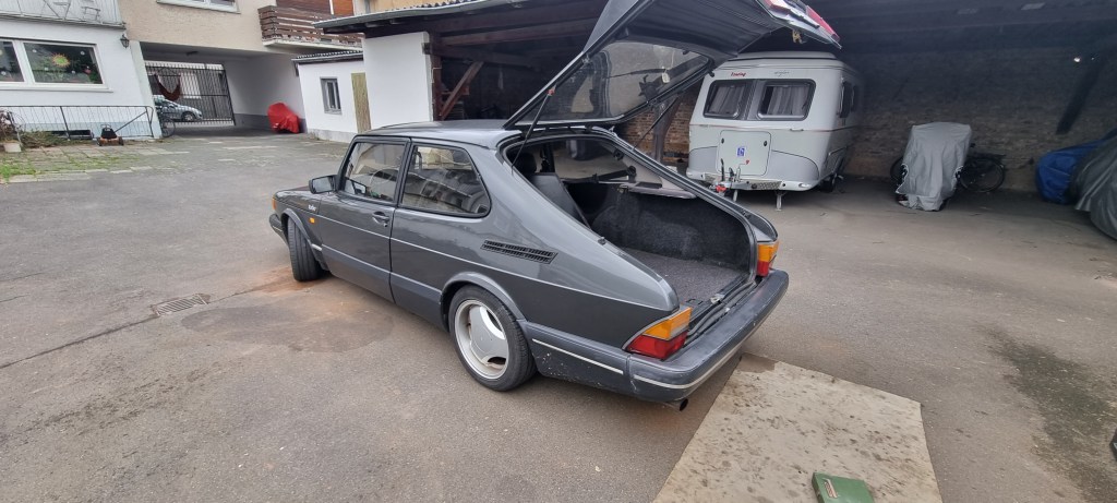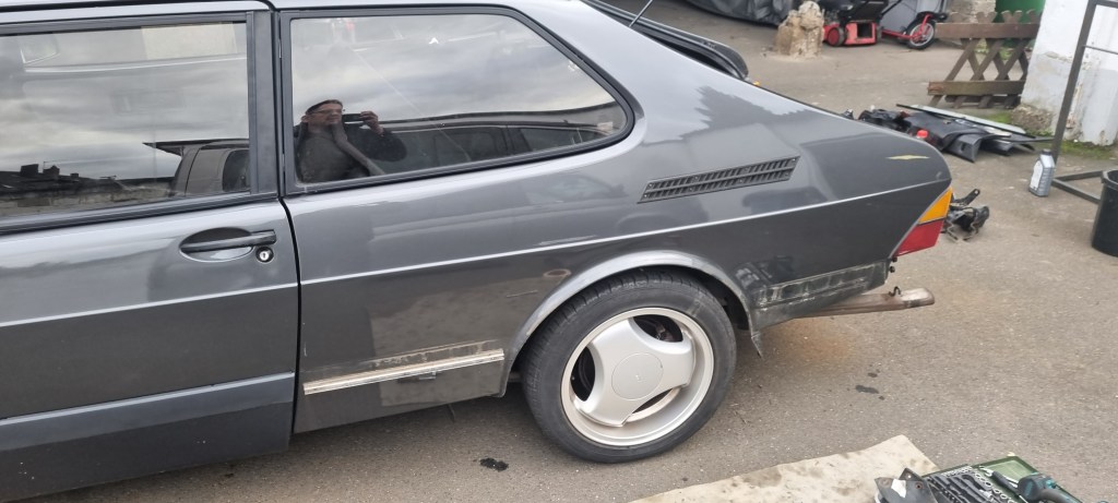 Most of the day was planned for Saabeth – my son’s car. The right rear wheel arch – a typical problem area on a Saab 900 – is badly rusted and needs to be fixed. The required repair panels are available at Scandix and I ordered them earlier this week. My job for this repair is to remove and clean all the Aero trim pieces and bumpers.