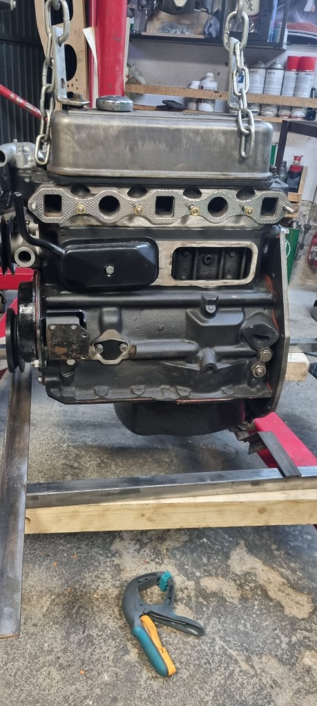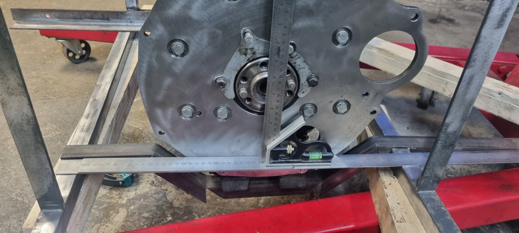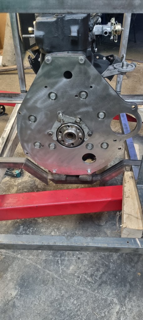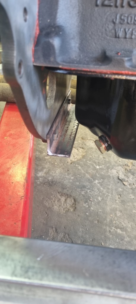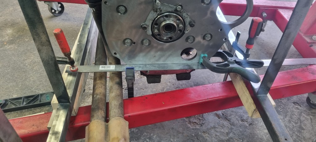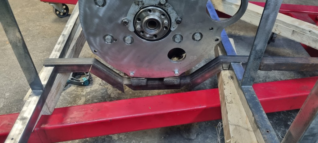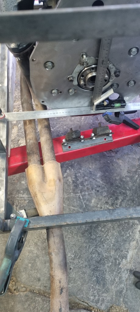 To find the right height that allows getting the exhaust pipe below the frame rail, I started by attaching an L-profile so the engine back plate. I want to be able to mount and test an engine without and with gearbox later. It mounted without gearbox – I still will use the old gearbox mounts. So, I attached those to this bracket.