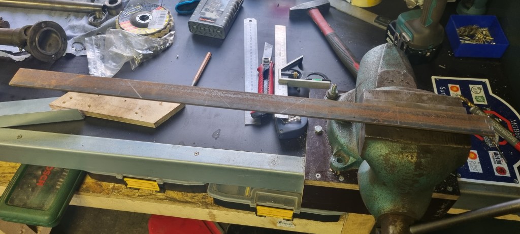 Next, I needed a crossmember that those rubber mounts will rest on. This is 8cm below the top of the frame. My castors are 12,5 cm. As I use 3cm L-profile for the crossmember – I will have 5cm ground clearance on the lowest point. Using the angle grinder, I notch out some parts where I wanted to bend the profile. Unfortunately, on my first attempt I used 45° cuts on the downward bend. I should have used 22,5° twice – as this will form the 45° angle, I need to clear the exhaust. Well, leason learned. The second attempt worked out much better.