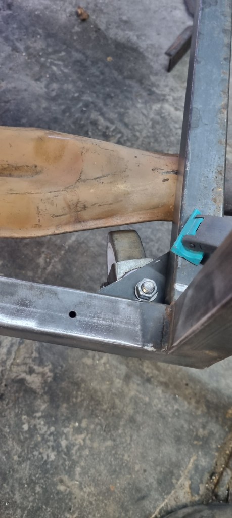 Finding the right position for the engine took a time with my trial & error approach. While the exhaust would clear the side of the frame if the engine were positioned on the middle line – I came to my mind that I should try this with the castors attached. Turns out I need to offset the engine 2cm to make this fit.