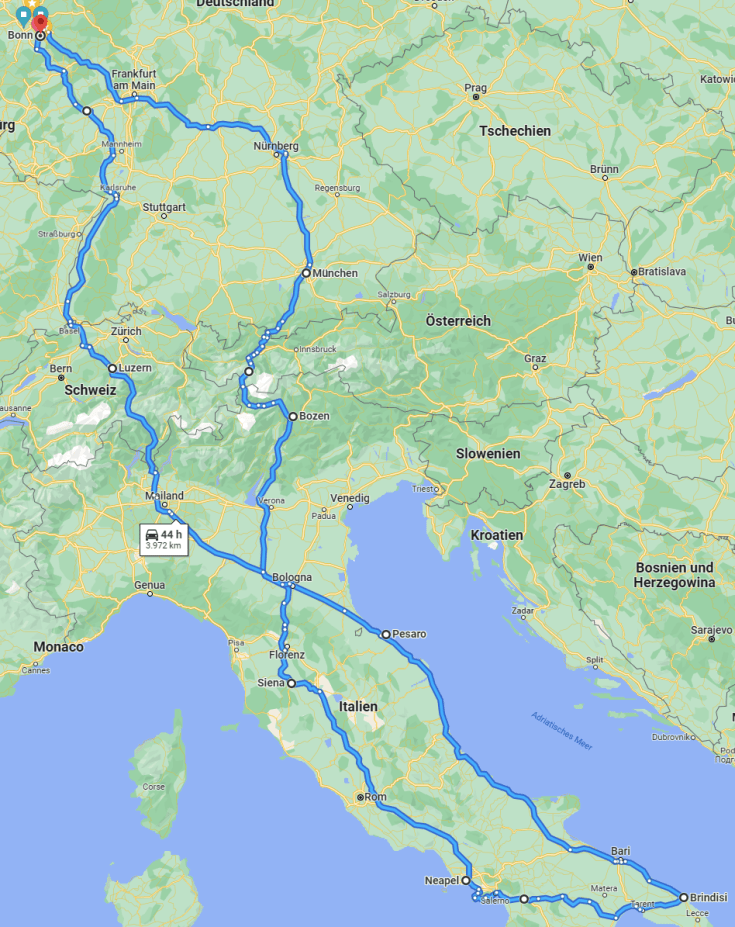 The ~1800km back will be divided into three lags – Brindisi to Paesaro, onwards to Luzern and from there on back home. The prep work on the Morgan will start this weekend. In parallel I will also make sure that Maggie, my MGB GT, is ready as backup. If she only had a sunroof…… maybe I should put on the one I have for the other GT ???