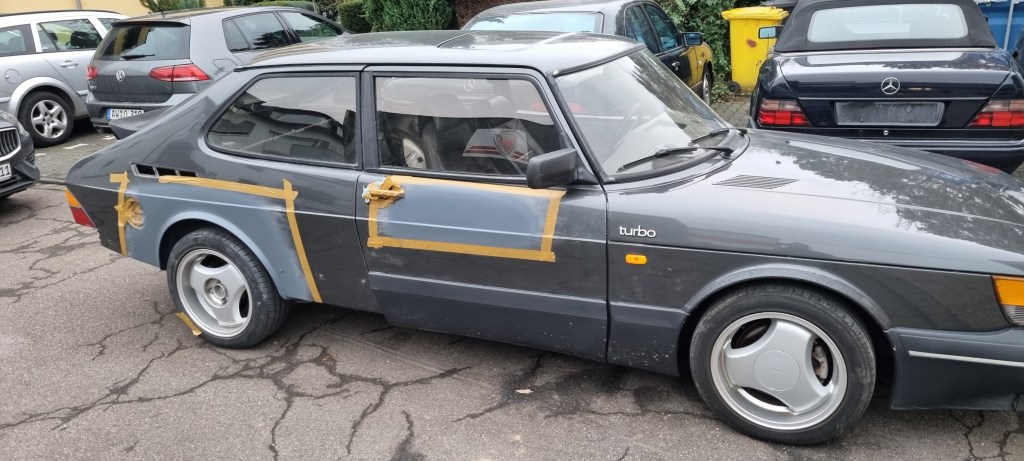 Today I was able to pick up the Saab after work. All rust spots have been sorted out – including a few on the rear I did not even notice before. I ordered need rubber seals for the Aero Part trim and need to get some brackets for the bumper powder coated before I can put back everything together. I moved the car to another garage and might leave it like this for a few weeks.