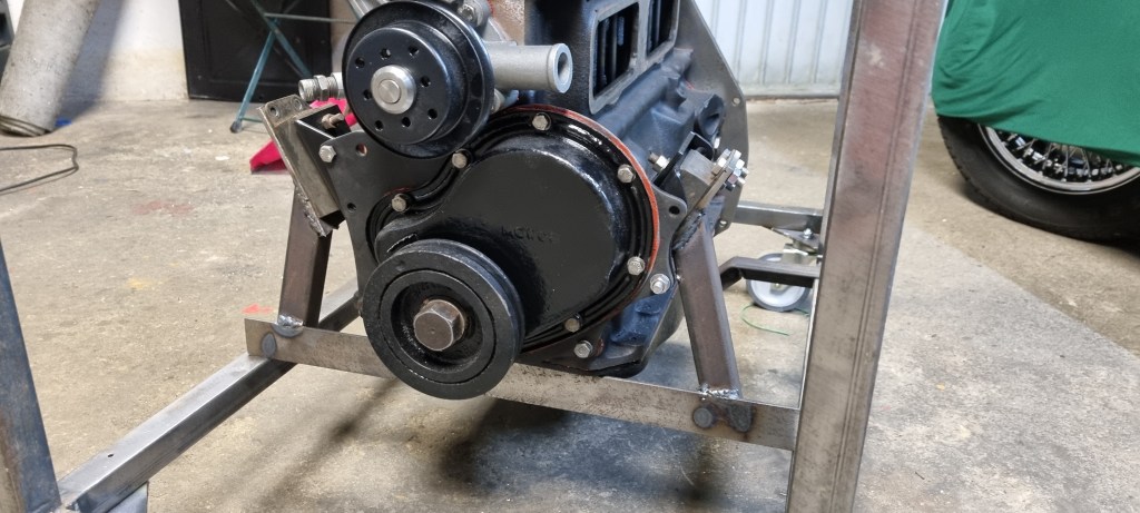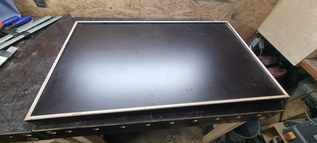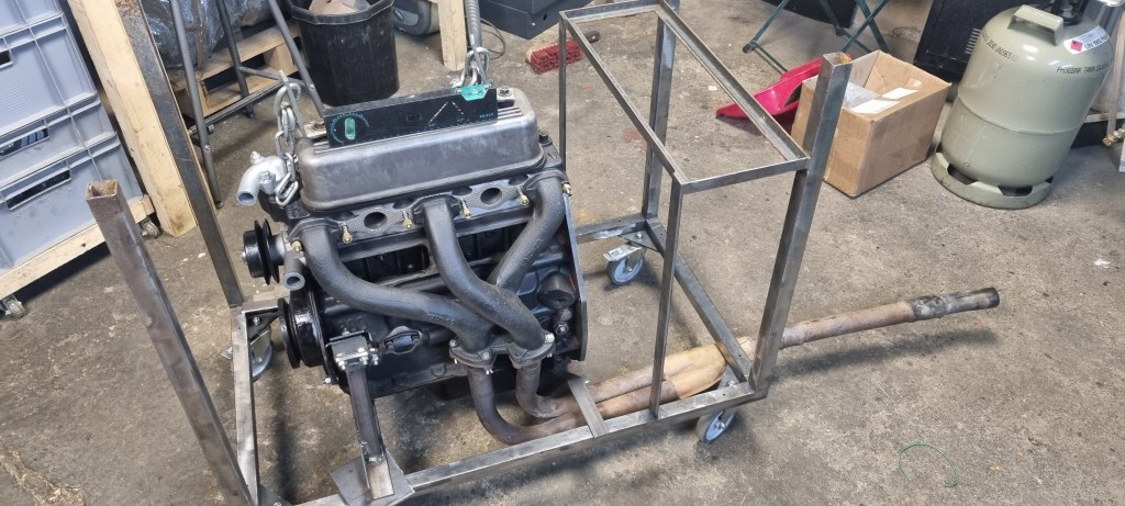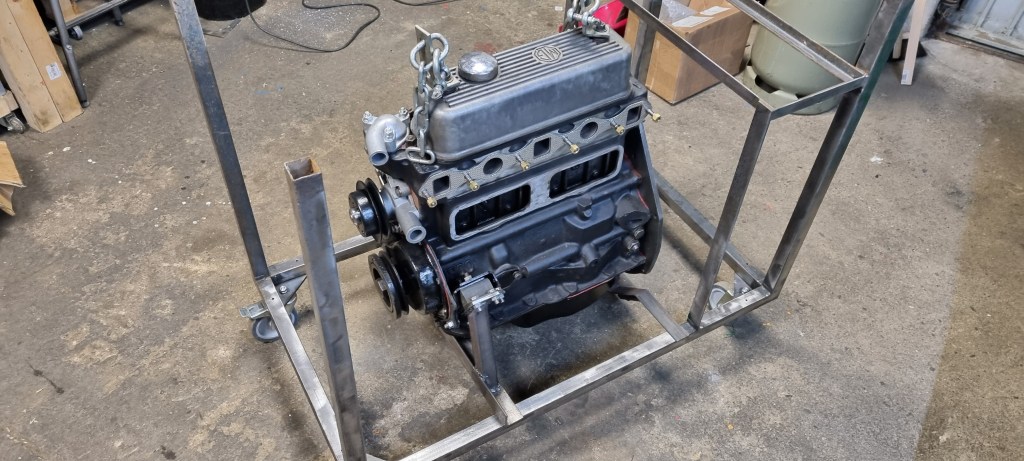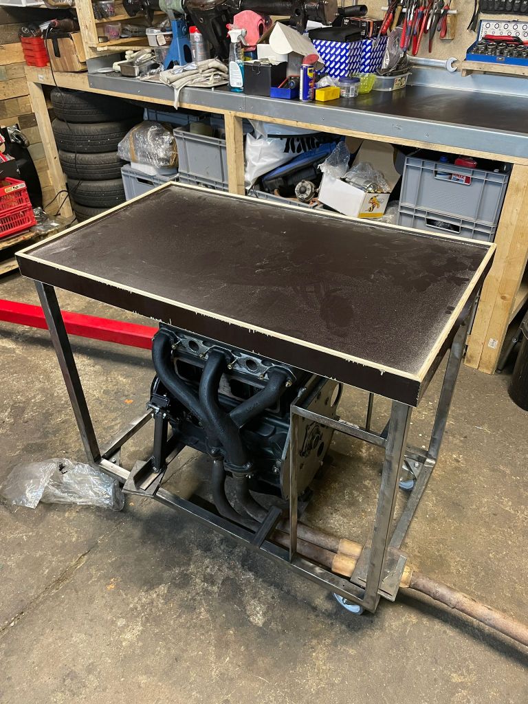 While not complete I am quite happy with the result already. Once done, I can store the fully assembled engine under the workbench and move it easily when required. An entire new set of tasks is to add all the parts to make it a real test stand – but dry fitting the exhaust this week already showed that this should work out as well. I can flip the old desk frame, place the engine on top of the frame and have a comfortable working height. Yesterday evening (after moving one daughter back home and help my older daughter to move out) – I at least managed to craft a table-top-tray in my basement. Once the engine is back in one of the cars – the frame will act as workshop trolley.