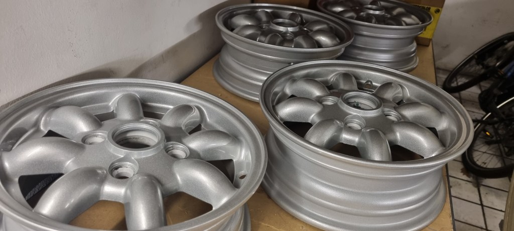Miffi (my Mini) is back from repairs (after somebody drove into the right rear corner). The rear right wheel arch is still missing. She is still on winter tyres. The original 12 inch Mini-Lite wheel just have been sandblasted and powered coated. New 165/60R12 Yokohama A539 should arrive soon, and I will do a minor service in a few days.