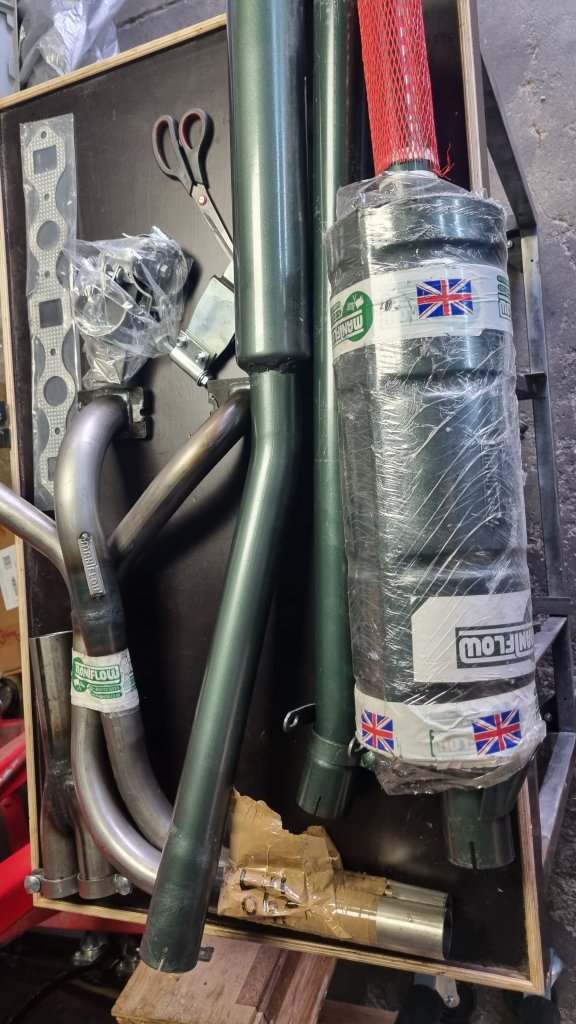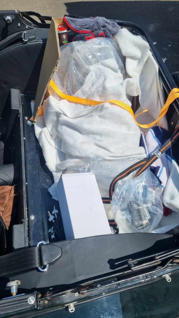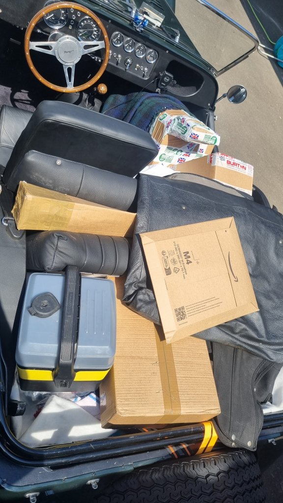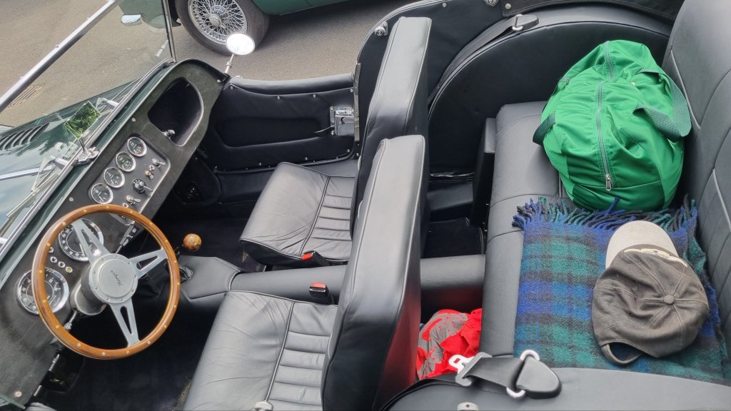 As I returned earlier than expected on Tuesday morning at 3am, I used the afternoon to unload the Morgan. In the picture below I already removed my suitcase plus some other stuff – there was not any room left in the Morgan for eg. new Dunlop D-Type wheels – which are on my wish list as well. The two biggest items are a new MGB Maniflow Exhaust system and a Vitesse 5 speed gearbox conversation – I will write a bit more about both in the next blog post. Several smaller parts are for the Morgan. There is plenty of work and tasks ahead – I certainly won’t get bored this summer.