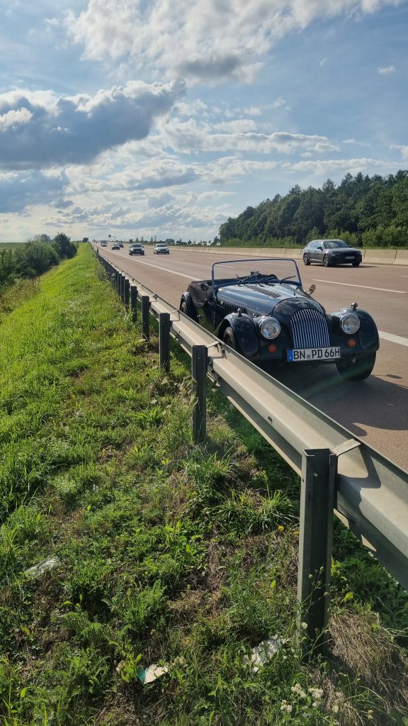 As I mentioned a couple times before – the Morgan is everything else but fast. Nevertheless it manages the 130km/h and it is easy to go with the mainstream traffic flow. Up to the Alphöhe the Autobahn A8 ascends in juts two lanes with a lot of curves. For unknown reason some overcautious drivers in front of me were doing 70 to 90 km/h.