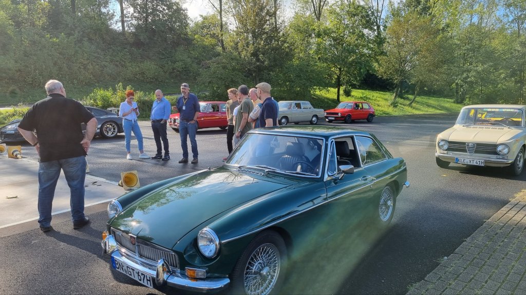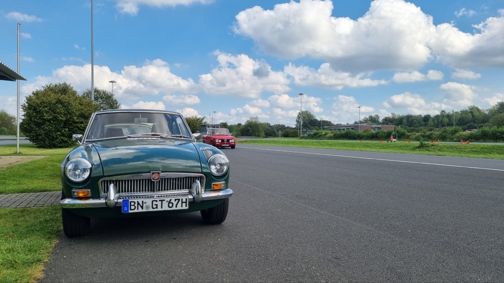 It is pretty much exactly a year ago that I did the last Driver Training. Last year Maggie’s cylinder head gasket blew on the way, and I switched to Miffi – my Mini Cooper – to do the Level 1 training. That was fun and really helped learning to handle the car much better. This year it was finally time to take Maggie for a spin on the ADAC track in Grevenbroich. The day started early, and we had perfect weather conditions. Our group consisted of nine cars – two fast and nice Alfa Romeos, a nicely maintained and tuned VW Golf (this gen), Ralph’s BMW 1802 as well as three Porsche and a Toyata MR2 – oh well and Maggie of course.