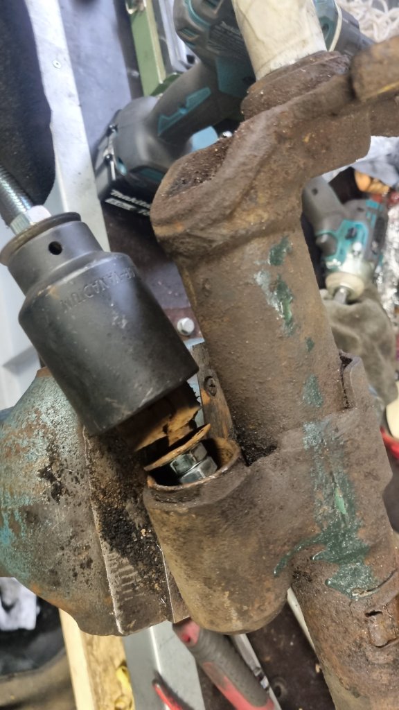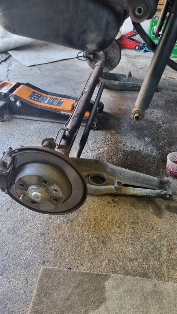 The last couple of evenings I only had a limited time to continue on Saabeth’s rear suspension. On Monday I removed the two last bolts from the support arms and got the entire axle out. As I earlier wrote – the right-hand side torque rod is difficult to get out. The fuel tank leaves hardly any space for a normal spanner. And because the bolt was really tight – I tried using an impact driver to get it out. Unfortunately, the spanner did not completely sit right on the nut, and I successfully rounded all corners of the nut.