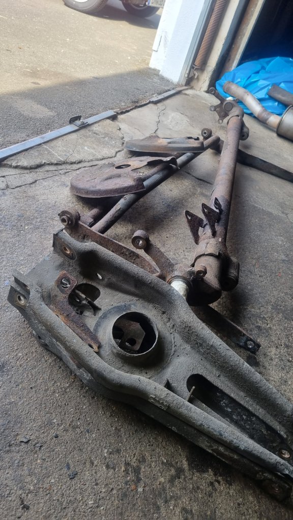 After I had all parts out and dissembled, I started removing the bushes. I decided to replace all – even though only the ones from the stabilizer and torque rods were clearly had visible faults. After I got home, I ordered PolyBushes and other spares from Skandix. As half of the bolts did not come off without fierce resistance – I decided to also replace all bolts. The suspension parts went off to blasting and powder coating.