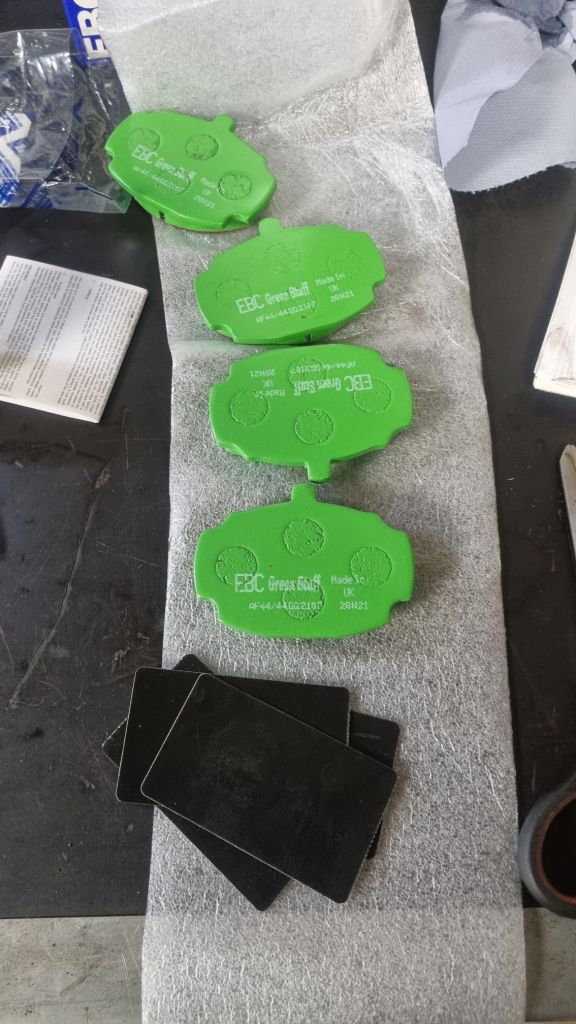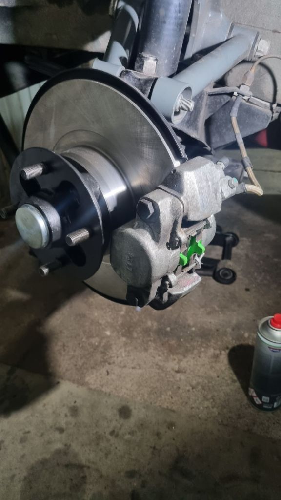 With the crossmember sorted – I could focus on the rest. The old brake discs showed significant wear after about 5 years of use. As I intend to swap the bolt-on wheel and running rear onto Mildred when she is done, it made sense to assemble the new brake discs I got for her. The cheap brake pads I put on back in spring 2021 had only a slight and even wear – but it is good practise to replace the pads when the discs are changed. Instead of going back to the Mintex M1144 it is time to test EBC Green Stuff that was recommended to me a couple times.