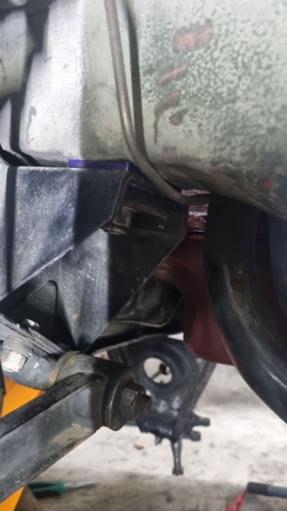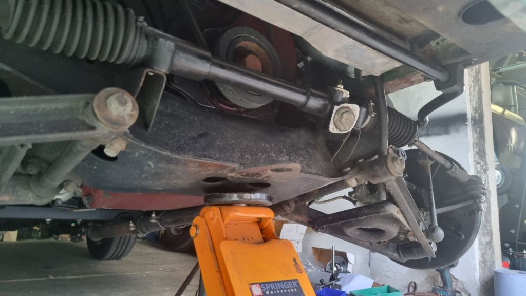 This way I could lower the crossmember a bit (around 1 cm) to get rid of the Frontline wedges and poly pads. I always had the crossmember supported by another jack and only took out one bolt at a time – leaving it supported with the remaining bolts. This worked perfect on one side, were the crossmember bolts had been seated with enough cooper ease. On the other side – one bolt was rusted. I pulled this by adding some oversize washers that acted as spacers and an impact driver from below.