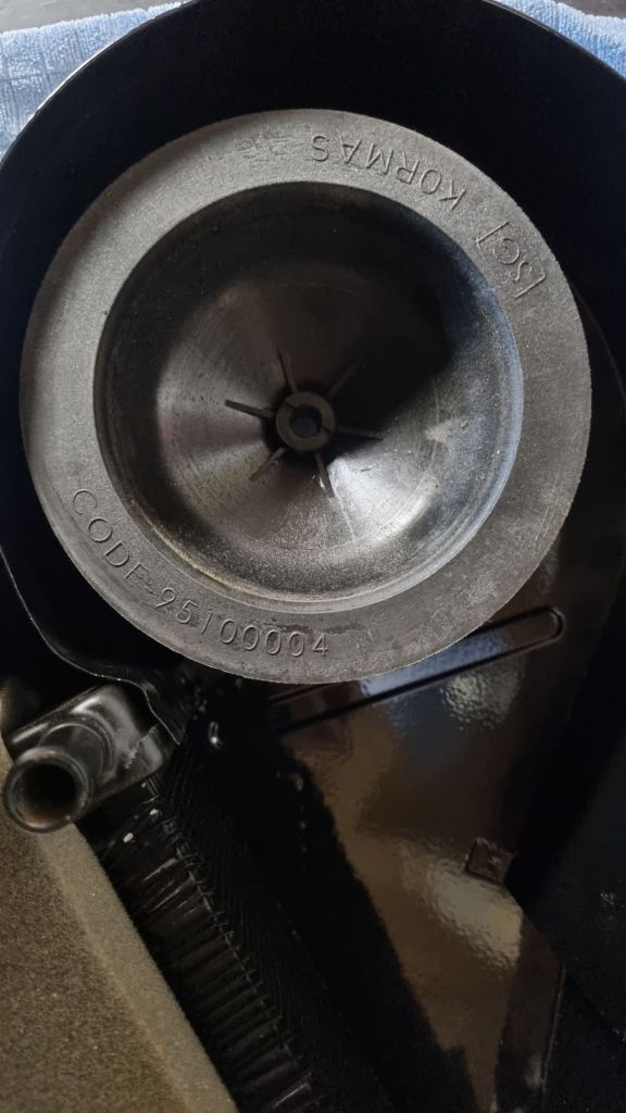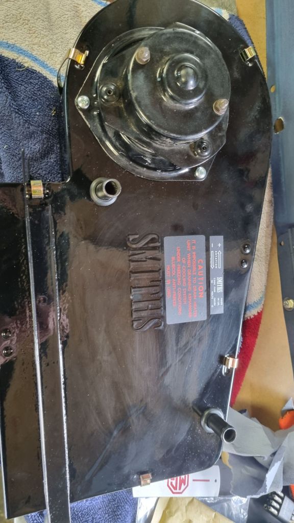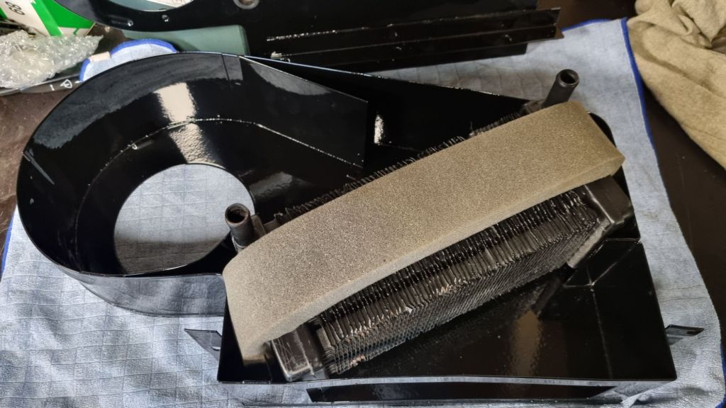 After manually removing the remaining paint and rust with a soft wire brush, I generously applied rust converter, primer and finished the box with a few coats from the spray can. It looked alright – but not as good as I wanted it to be. The rust removal left too many dents that still showed through. At some point in 2022 the replacement parts from MGOC arrived. An upgraded heater core, a larger impeller and a new two speed motor also found their way to my workbench. The larger impellor requires a small modification inside the heater box. And this is something that I pushed out for a while.