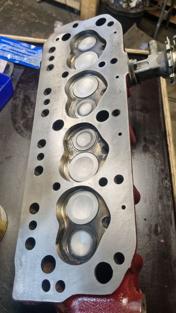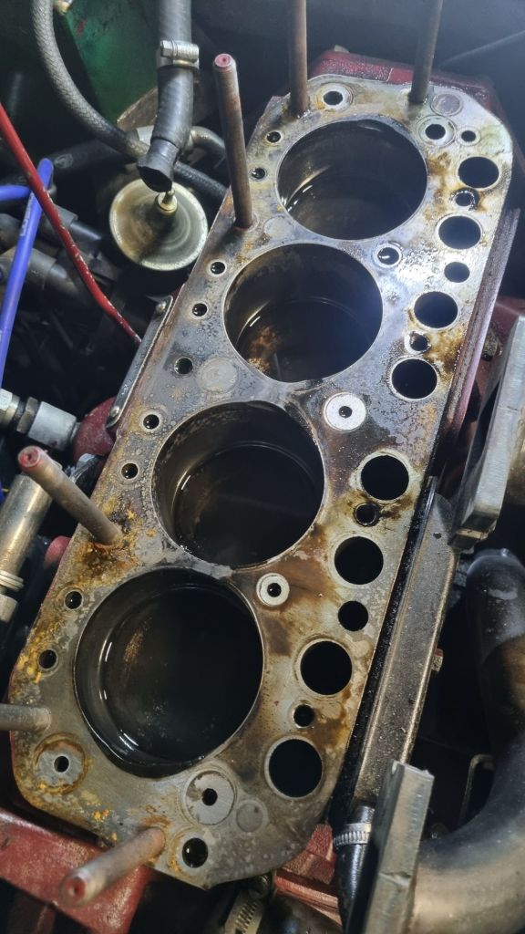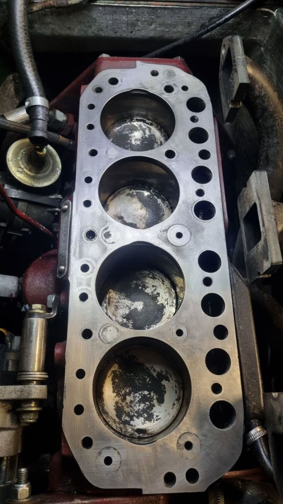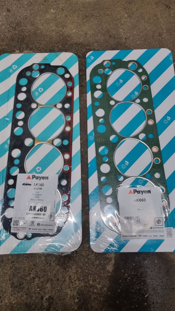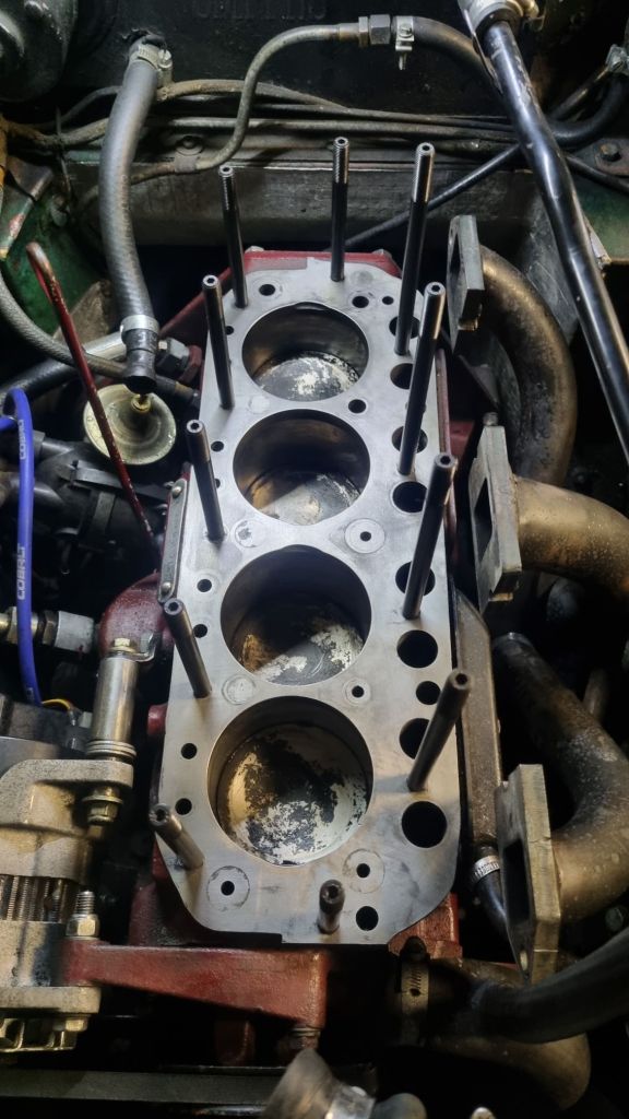 To check if the piston rings are still ok I filled some fuel in each cylinder. They were all holding the fuel for more than 10 min – so I am confident that the piston rings are still in good shape. Somewhat surprising was the delivery of the new Payen AK660 head gasket. Usually it is black with some red and some enforced areas. The new one is green and looks a bit less promising. I will use it on the 18V582 engine but went with the one I got for Mildred’s engine.