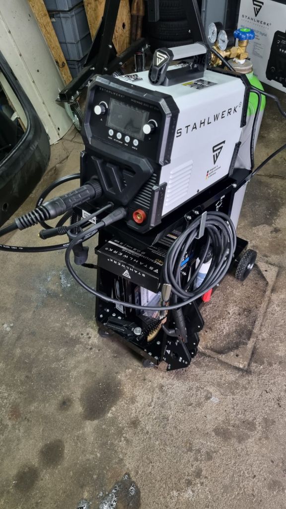 Working with 2 and 3mm steel is really easy. Next I moved to 1mm sheet metal. Welding up smaller pieced of new metal works well – the spot-weld function is quite helpful once you got the right settings. A major downside is that after about 45min working time the main fuse for the power in the garage blows. The old cables running to my garage are most likely not sufficient. Not sure what to do about this. I only rented the garage – pulling new cables is not an option. If I only use the welding machine for short periods it seems to work fine.