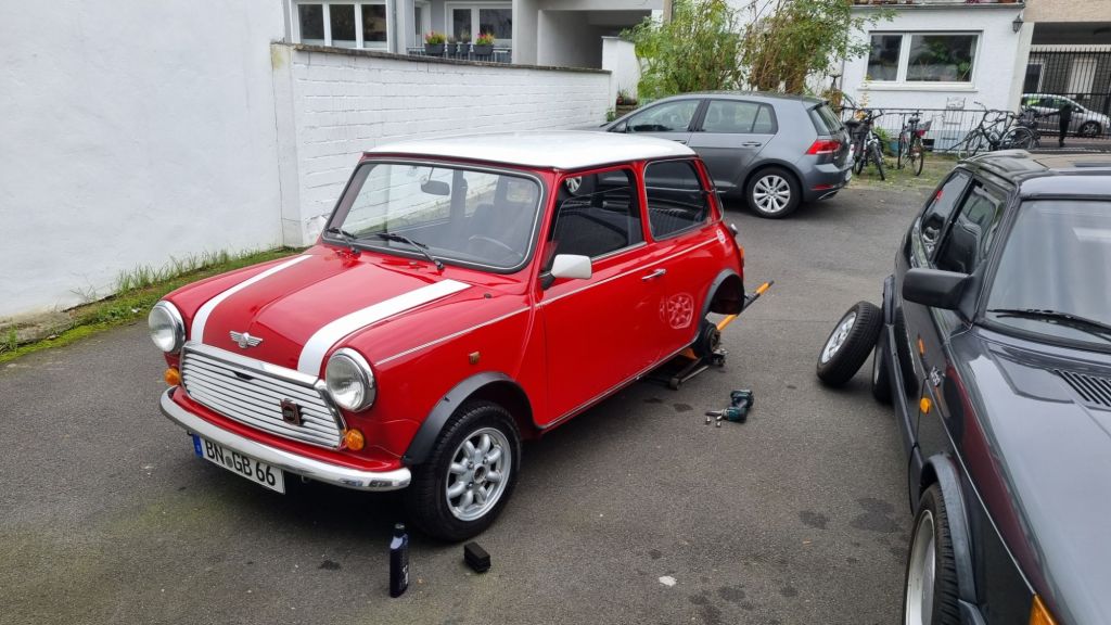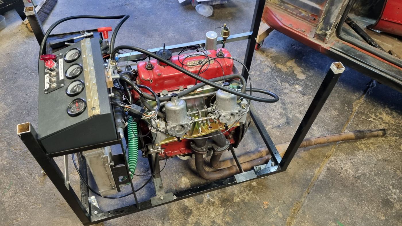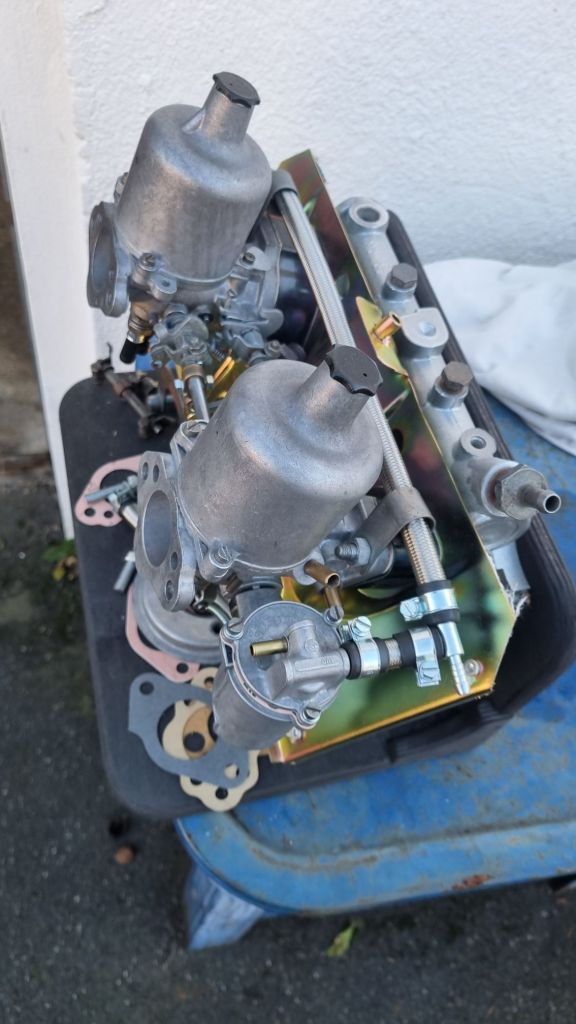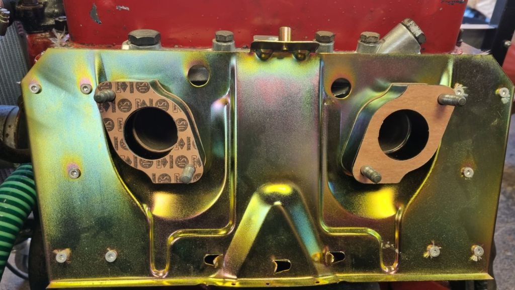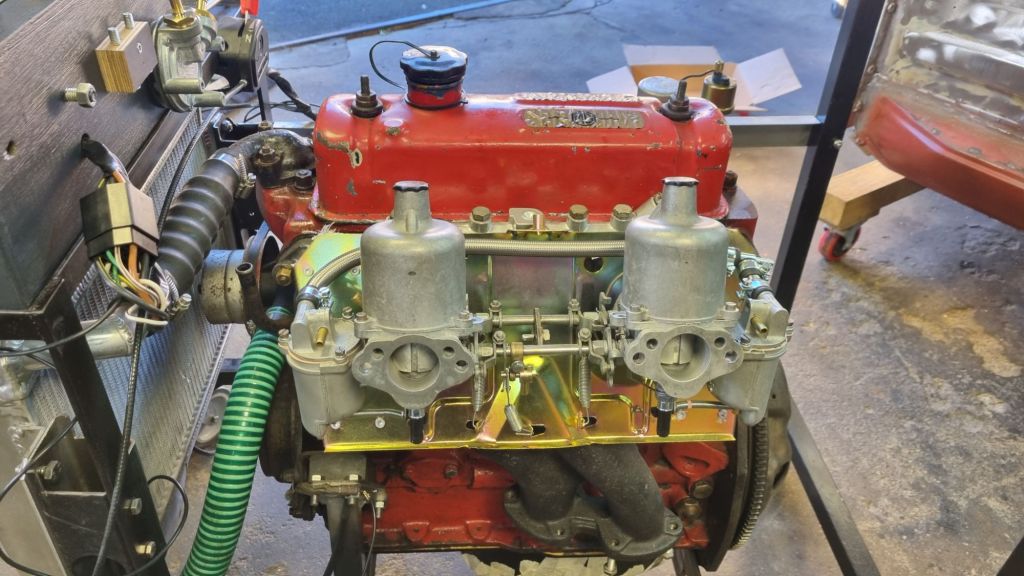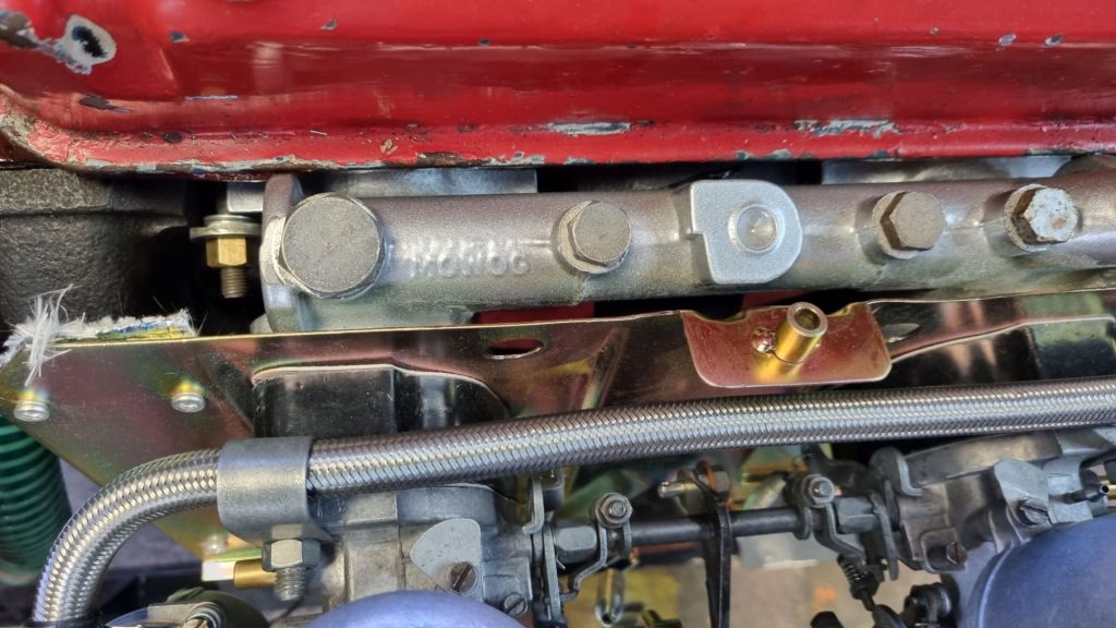 Last step was to install the HS4 carbs from Mildred. A Hardy fuel is mounted inside the control box I have built and I connected all lines to the SU carburettors. The vaccuum port on the inlet manifold for the brake servo was closed with a matching screw. I did the carb overhaul two years ago and could not remember all steps for the basic tuning – I leave this for tomorrow.
