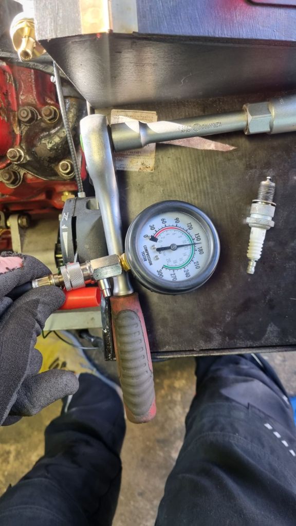 The mystery 18V582F engine I got from Frontline last year, was prepped with a cleaned oil sump. I checked the torque of the cylinder head and rocker shaft – which was good because somebody obvisouly had played around with it. Valve clearance was next on the list.As the engine did not run for at least one and a half years, I sprayed a tiny bit of oil in each piston. The new oil filter was also pre-filled. I turned the engine crank with a wrench on the main pulley a few times. The first test of my rig was to see of the starter can bring the oil pressure up. And sure enough – after a few turns the cheap China gauges will show perfect oil pressure. A compression test followed and all cylinders look good.