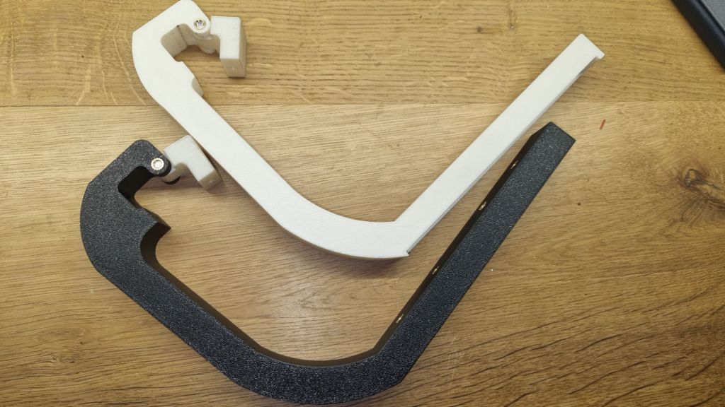 The holders also have additional threaded inserts on the back. This allows attaching further addon – like a simple mounting point for a mobile phone charger. This time I opted for a gripper with integrated wireless charger that automatically closes with a small servo. This looks very promising and will be tested out soon. The Brantz International Pro 2 and the Timer V2 are screwed onto an aluminium plate (300x175x3 mm) After much consideration I decided for this size as it large enough to all components – but just covers the glovebox lid. Also there was only one good position for the left holder clamp as the heater control cable otherwise interfere. As a matter of fact – for installation the lower control needs to be turned all the way in.