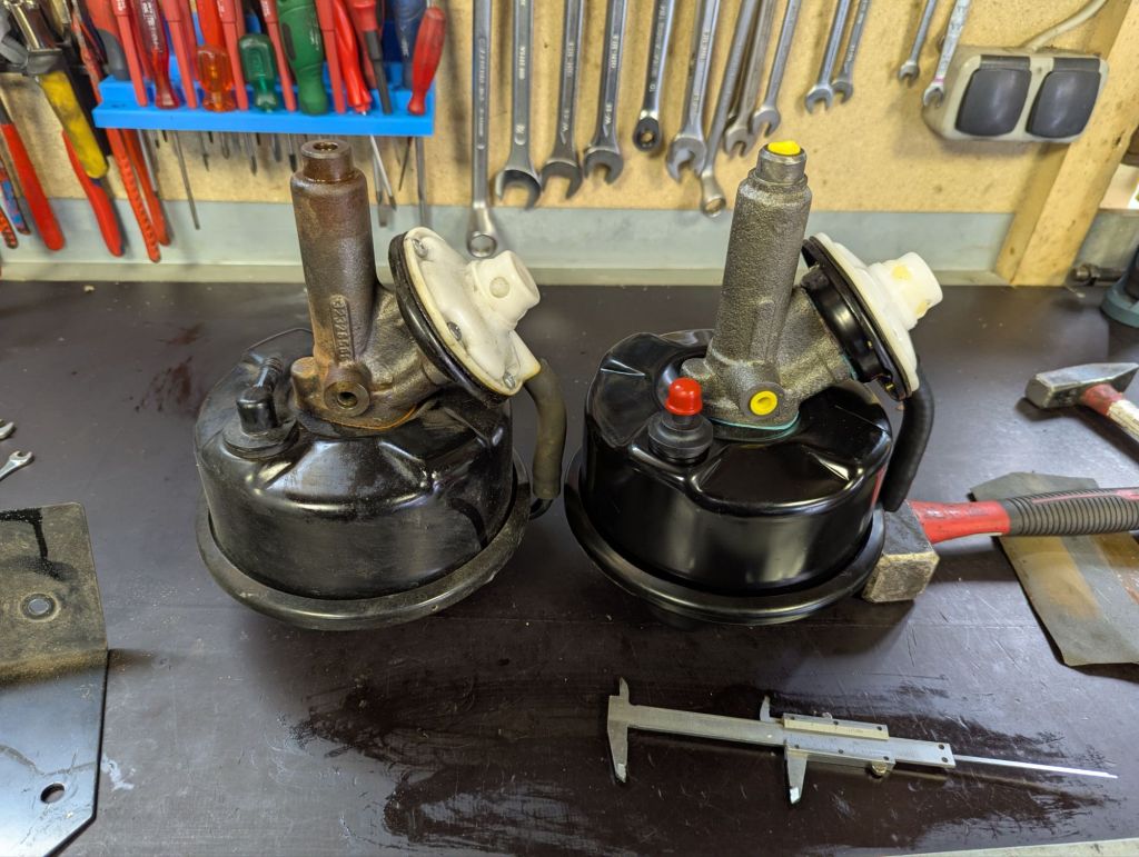 I ordered 0.2mm and 0.5mm shim washers with 11 and 12mm internal diameter. With those placed between the stux axle and caliper, I was able to get the disk centered again after a few attempts. While doing this I also noticed that the rubber piston seal on my rebuilt Lockheed calipers had failed. This way the piston did not retract the same way. As I had to get the car back onto the road for various reasons, I opted to install the aftermarket calipers with the EbC Greenstuff pads – something I tested last year for a few weeks.