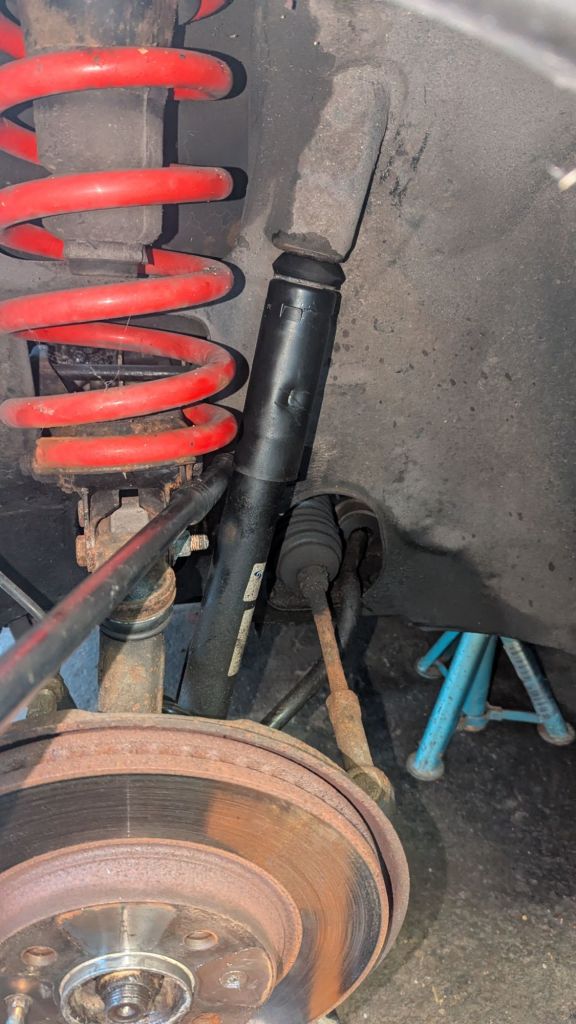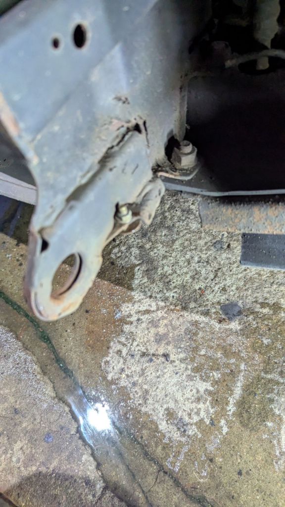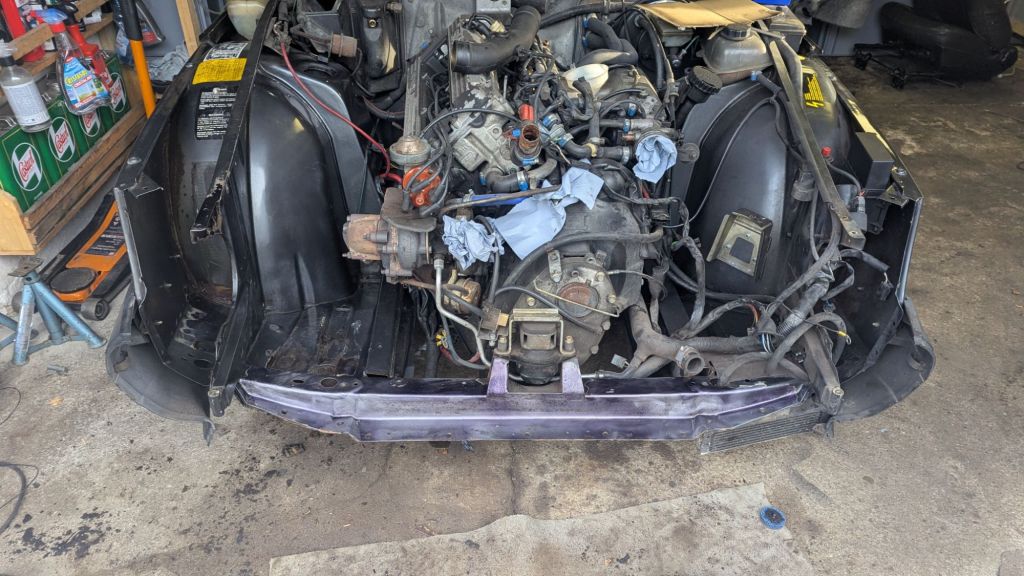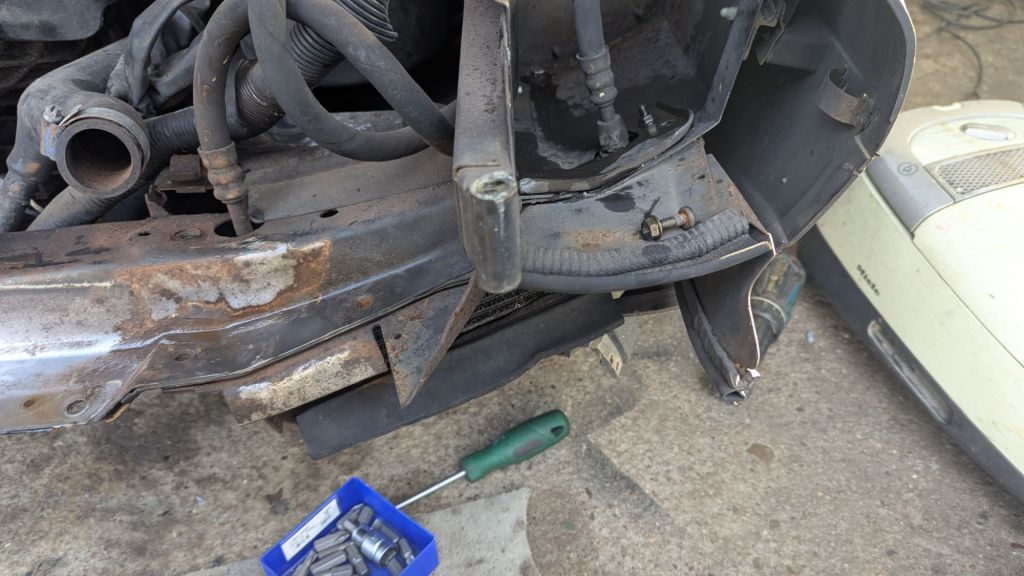 … but then again – why shouldn’t I once I am here? As I need to replace one of the indicators I broke a while ago, I would need to take out the headlights anyway. This revealed even more rust. The front bumper just has two bolts and is quickly removed. This gave unrestricted access to the old AC heat exchanger – that sits in-front of the radiator. Both are bolted to the cross-frame. My son bought the car with a removed AC compressor – the remaining components were left in the car. While inspecting those in the right front wheel arch – more are more rust was found. It was quickly clear to me – that I had to remove the entire front section. This revealed a dodgy welding repair of the water cooler – and more rust. All of these parts should be sandblasted and powder-coated. But in the end – this is my son’s car, so … ah come on.