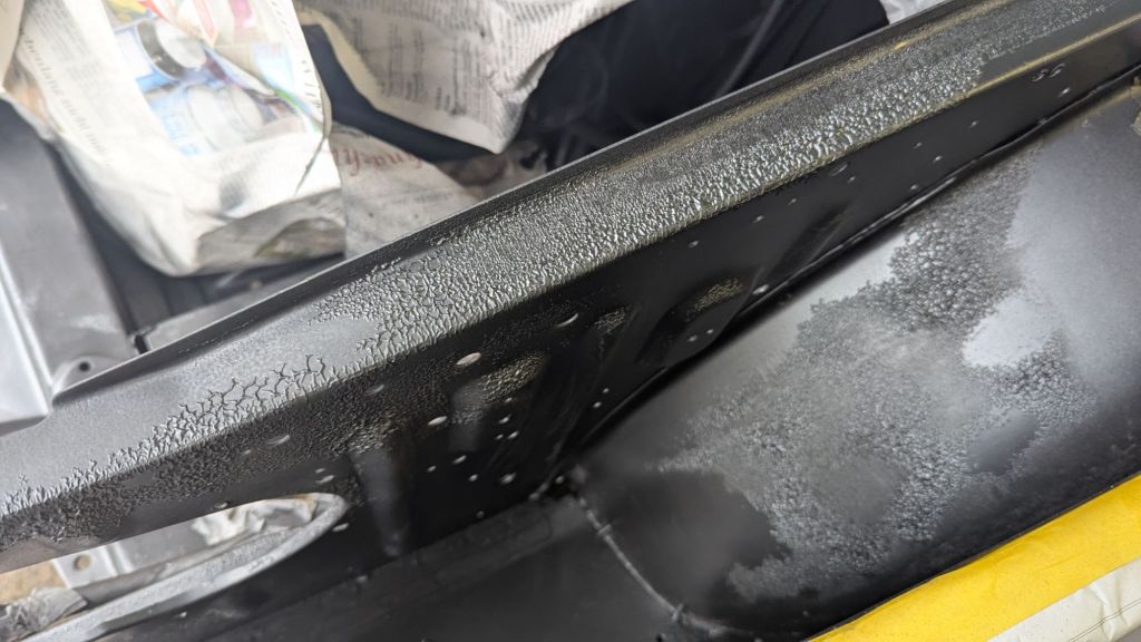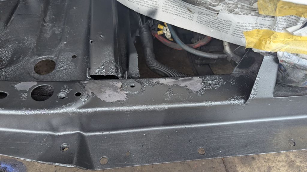 Next up is to clean the entire front again and remove the paint I put on. This time I will use 120grid sandpaper for the most part. I might use rust converter (Brunox Epoxy) for hard to clean or hard to reach areas. While I now have two cans of MIPA 1K epoxy primer – I believe I will use Brantox Korrux 3-1 in grey this time. To be continued