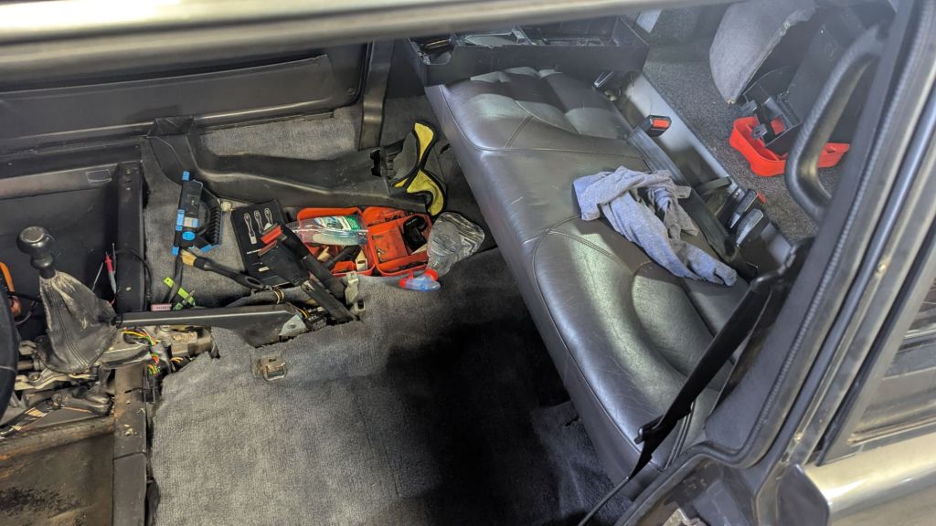 … but then again – why shouldn’t I once I am here? It would take a few days until the parts arrive. The professionally cleaned carpets and freshly powder-coated door sill scuff plates came back in. So did the lower part of the rear bench. The metal holder of the upper rear bench is bent and the leather of the driver seat also needs some TLC. Stitching leather is nothing I am good at. Two companies I requested for the repair turned me down – they would full replacements, but not repairs.
