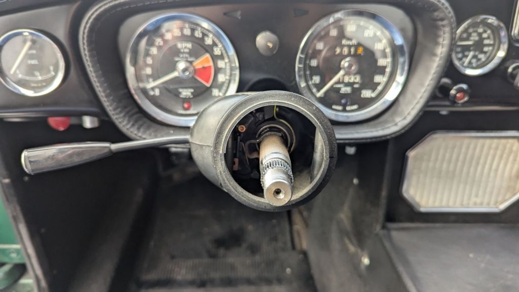 Mildred’s new body shell is from 1970. It lacks the required mounting brackets for the newer types steering column. It is designed for the earlier type of collapsible variant BHH515. The outer diameter is slightly smaller with 1- 1/4inch (~32mm). Before 1968 the non-collapsible variants 17H6577 and 37H4768 existed. These seem to also have been available with steering lock (7H6972 and 37H4767). While I am not 100% sure if the old one from my 1967 MGB GT is actually original – I believe it to be 37H4768. It also has 1-1/4inch in outer diameter.