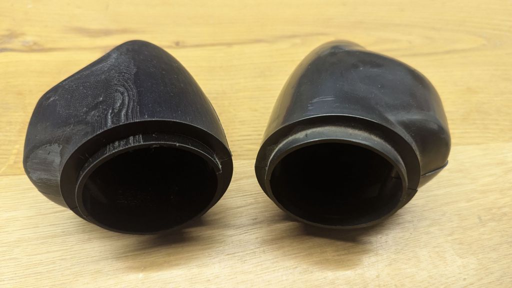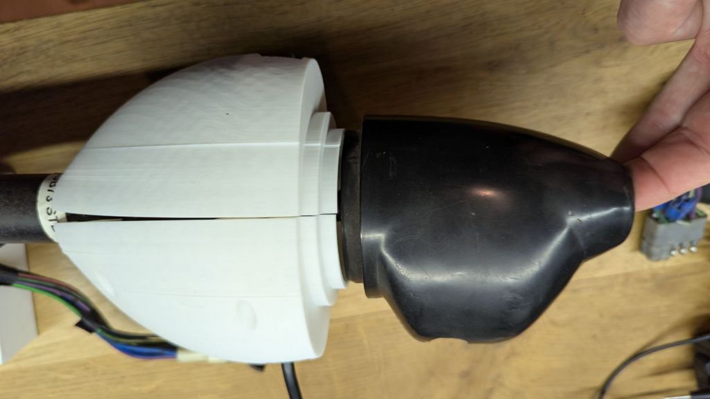 Of course this automatically brings up the next challenge: Which cowl will fit this setup to cover the stalk? The late MGBs had a different dashboard. This had a much larger cutout for the cowl. An item hard to find nowadays. Thankfully, Kevin Wells made a copy of two variants and shares the STL files for 3D printing on this site and here. Kudos to him. I downloaded the files. Then, I started thinking on how to put a square peg (more or less) into a round hole. The early dashboard is quite different. It has a small cutout (rounded on the top) for the steering column. The early cowl (18G8713 for RHD and 18G8714 for LHD) is also much smaller and – at least in my opinion – more elegant . But it was never designed for a wiper stalk. And because it has a top and a bottom half, it is also not possible to somehow combine the LHD and RHD. Besides, AAU4991 (or AAU4995) are a bit wider.